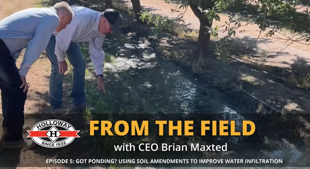 Maxted and Lenander discussed ponding issues earlier this year, following a rash of storms that slammed California to start the year. In Episode 5 of Holloway’s From The Field Series, the two revisited a customer orchard to see how soil amendments such as gypsum and compost helped improve ponding and water infiltration issues.